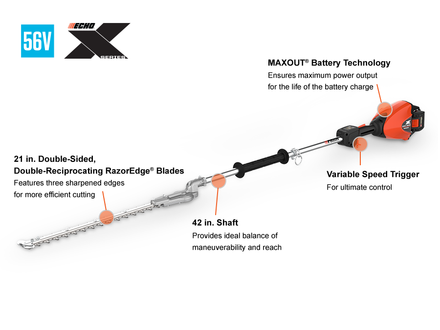 The ECHO 56V DSHC-2600S Shafted Hedge Trimmer is engineered for professionals who demand precision and power. With MAXOUT® technology, it delivers maximum output for the duration of the battery charge, ensuring consistent, reliable power when you need it most.